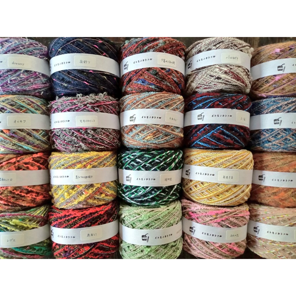 イトモノカラフルの毛糸玉は、工場で余って使われなくなった糸達をアップサイクルし、引き揃え糸として生まれ変わらせたものです。
