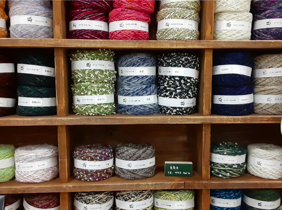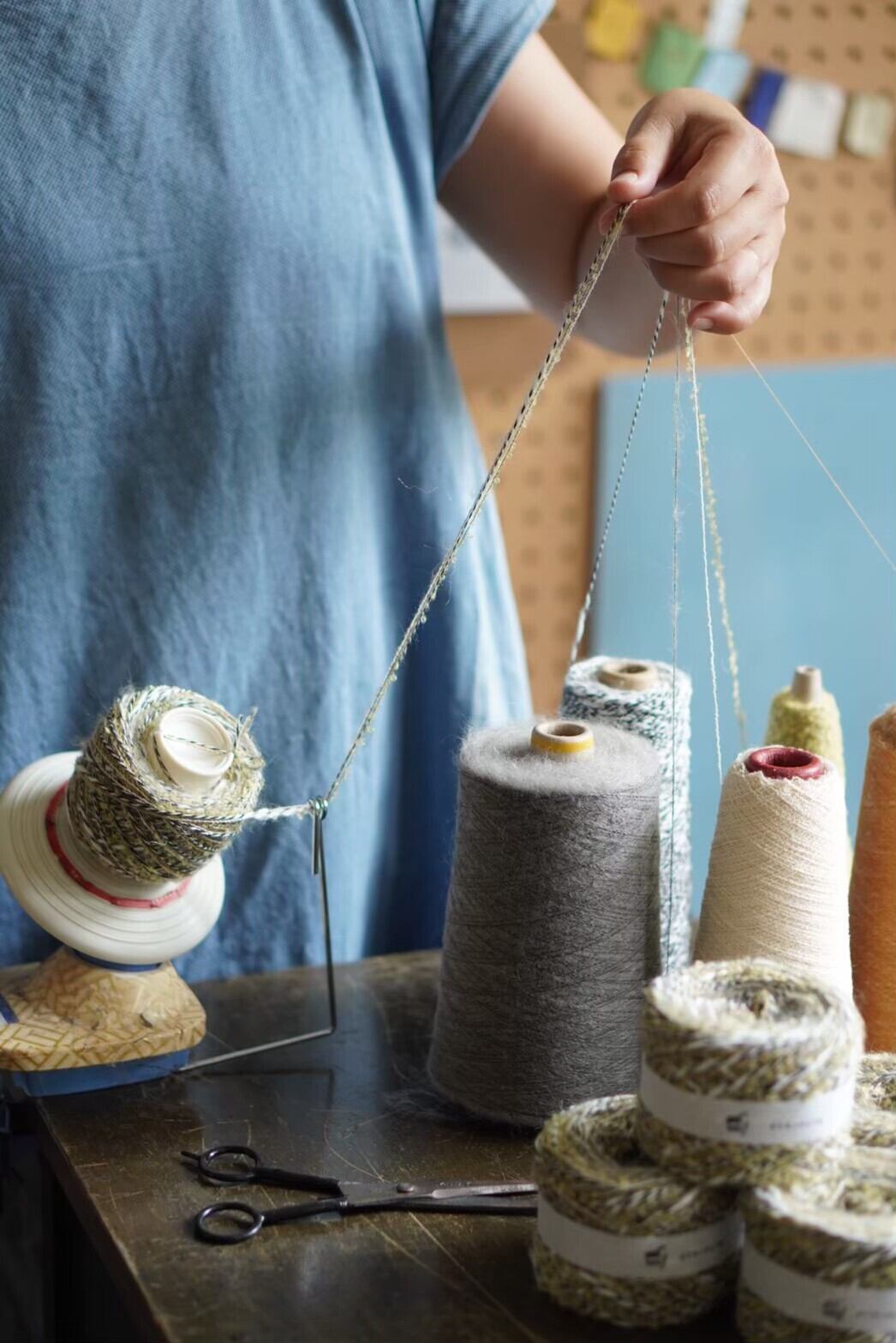 くるくる巻いた引き揃え糸たちを使って、編みものをしたり、