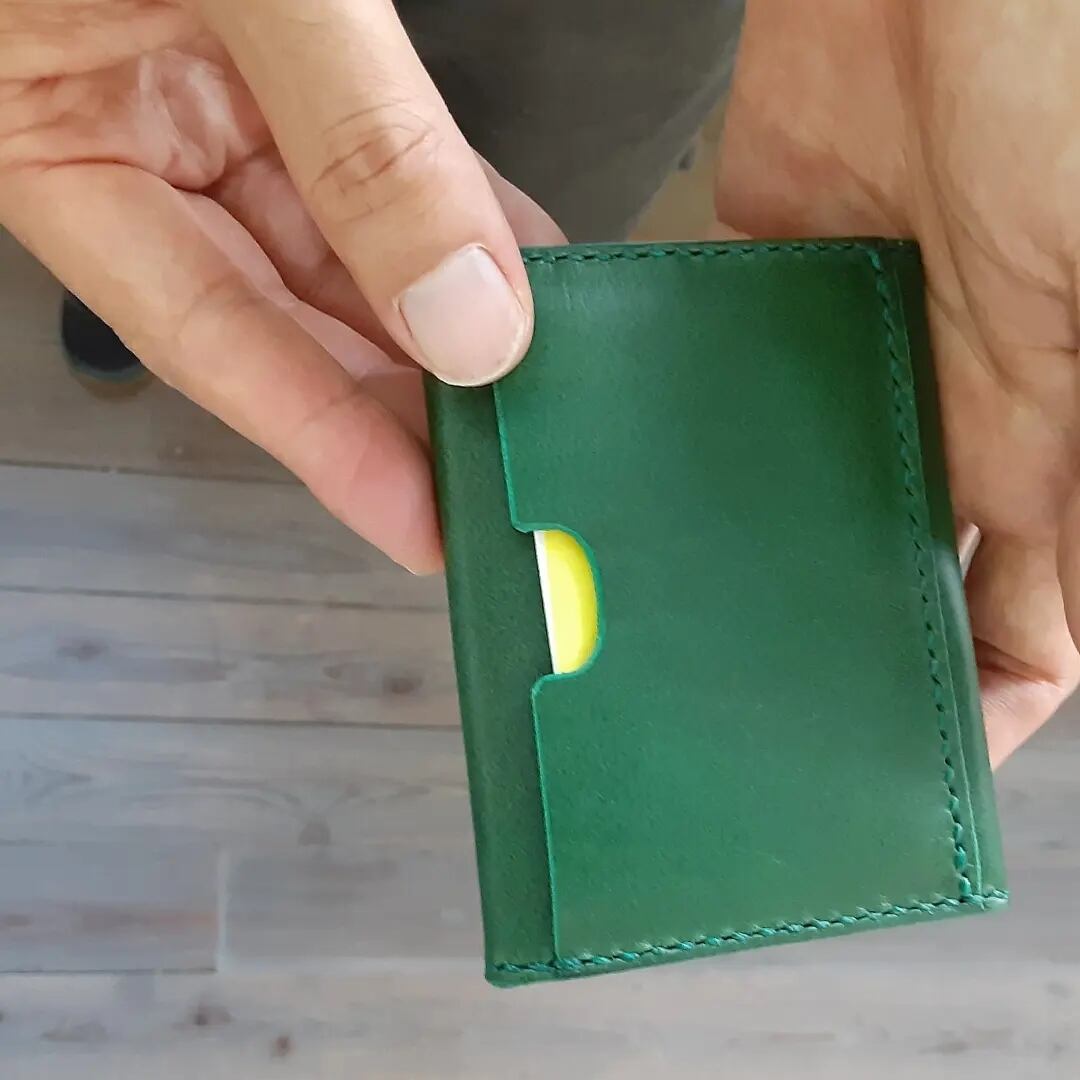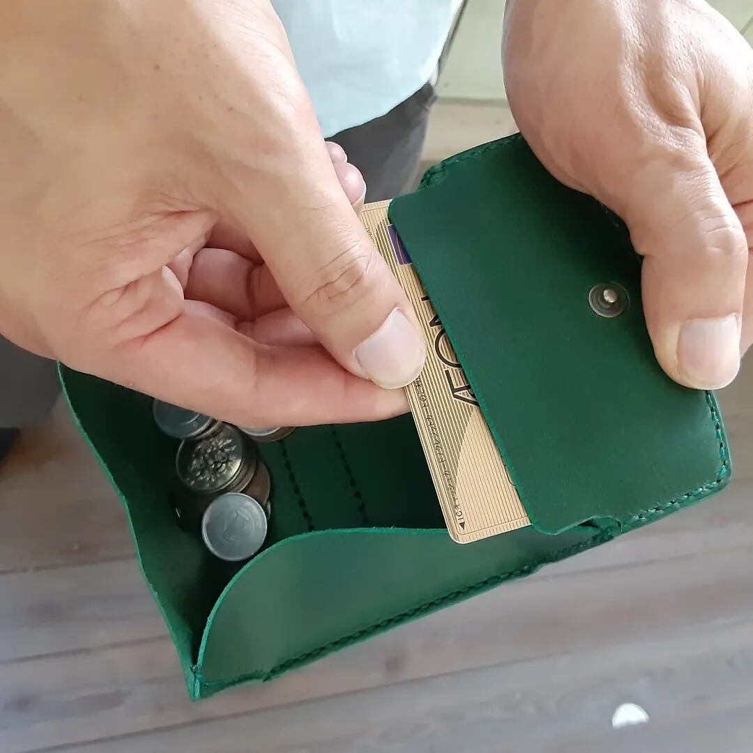 コインケースとして作っていますが、外ポケットにはカードが2枚、内ポケットにはカードが1枚orお札を少し入れることができます。