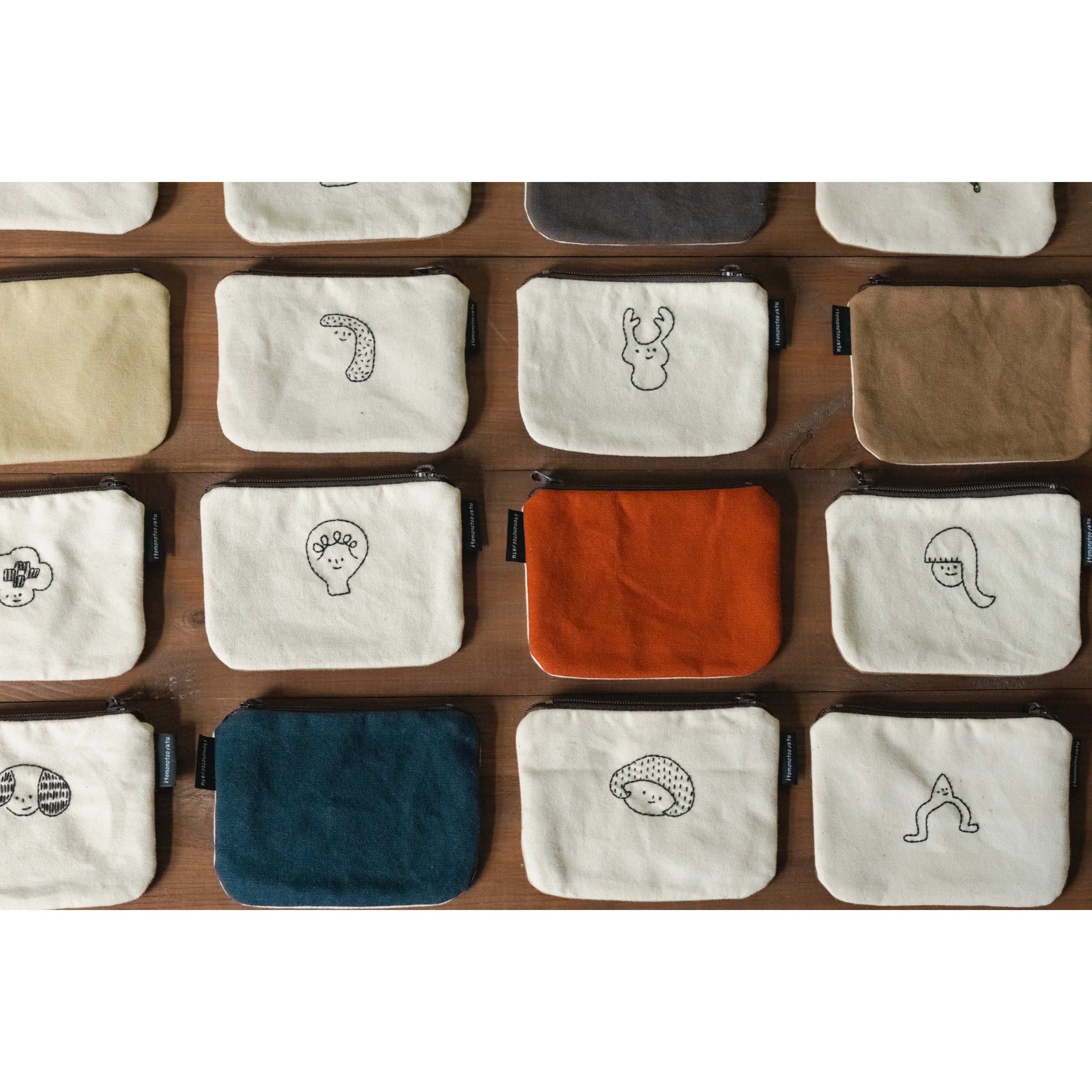 ポーチには「こえり工房」の独創的なイラストが刺繍されており、可愛らしいデザインが特徴です。この小さなポーチは、日常の小物をかわいく収納できる用途にピッタリです。サイズ感も絶妙で、持ち運びやすく、バッグの中にすっきり収まります。